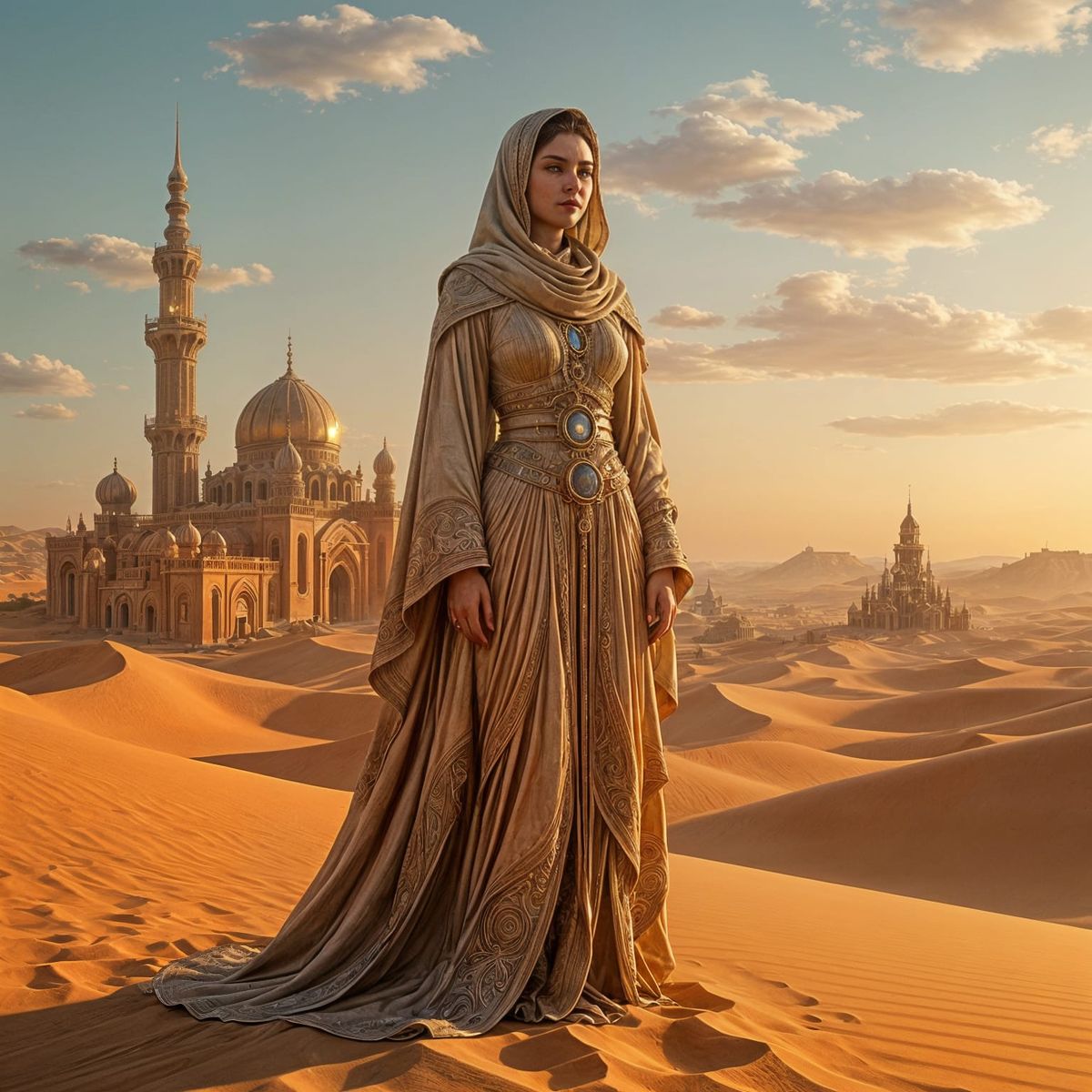 A woman stands silhouetted against a desert cityscape at dusk. The scene features volumetric lighting, hyperdetailed textures, and glowing clouds, with Middle Eastern and steampunk architectural elements.