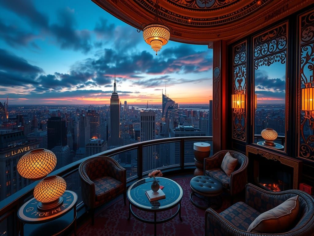 This image depicts a lavish penthouse interior, blending maximalist decor with art deco patterns and triadic colors, set against a backdrop of the city skyline at twilight, evoking a sense of dystopian luxury.