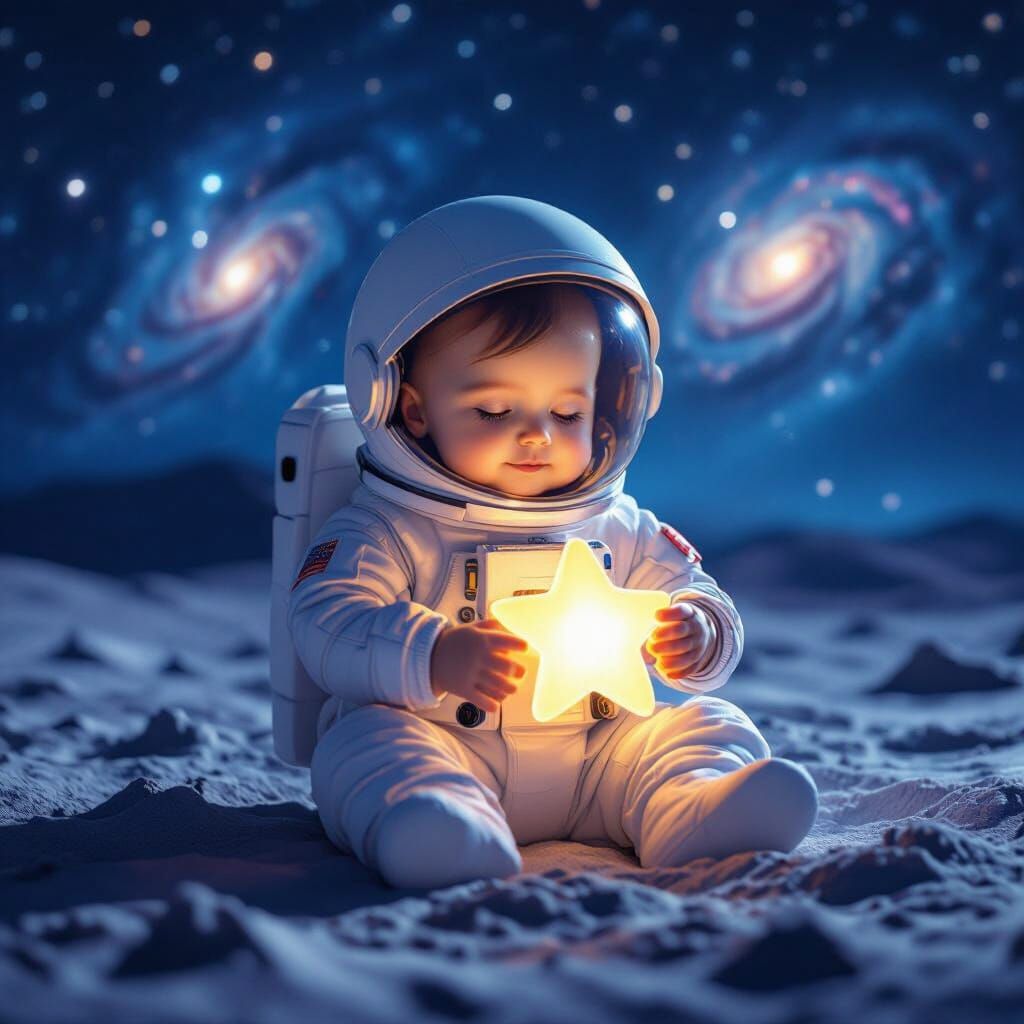 This photorealistic image shows a baby in an astronaut suit on the moon, holding a glowing star against a dreamy galaxy backdrop. Ultra high definition with soft, ethereal lighting.