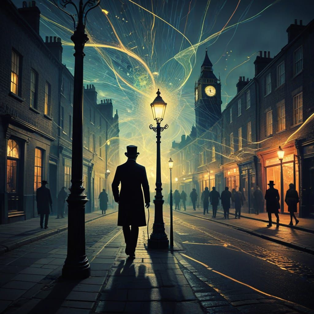 Silhouette of a gentleman in a top hat walking past a glowing lamp post on a charming street in London in the 1880s. An image assembled from scribbled lines and shapes blurring into a vibrant, dreamlike background, in the style of Salvador Dali, M.C. Escher, and Ash Thorp, with bold, expressive lines ...