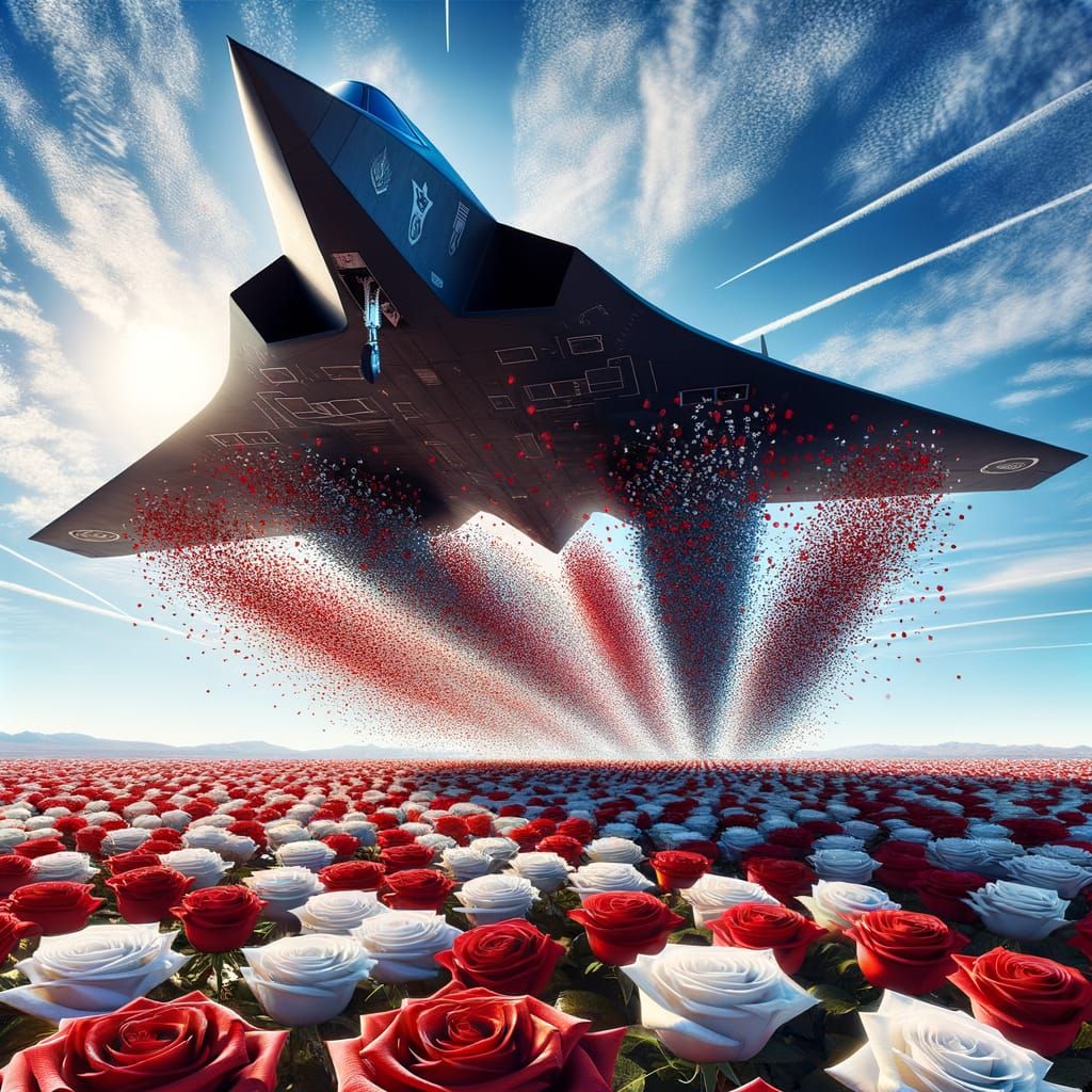 A photorealistic image shows matte black stealth aircraft releasing red and white roses against a clear blue sky. The wide angle perspective highlights the aircraft's size and aerodynamic design.