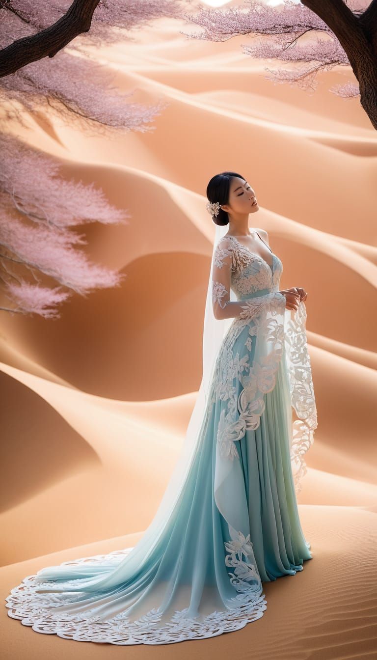 A captivating portrait of a veiled woman with elaborate Kirigami-style stitching. Soft pastel colors, sand textures and elemental ink create a dreamlike quality with warm, natural lighting.