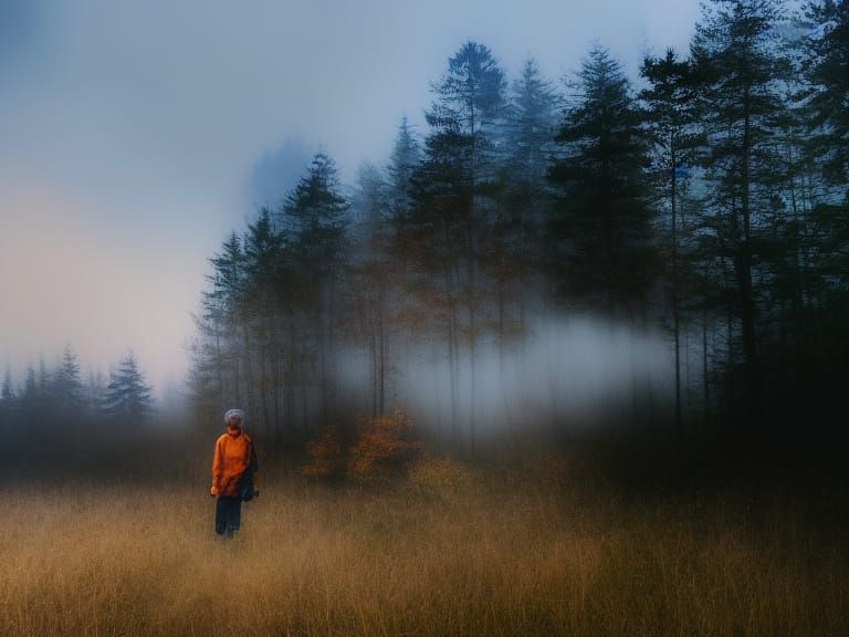 A person stands in a misty forest, illuminated by golden light. This image captures a cinematic moment rendered with soft brushstrokes and a warm color palette, reminiscent of impressionist oil paintings.