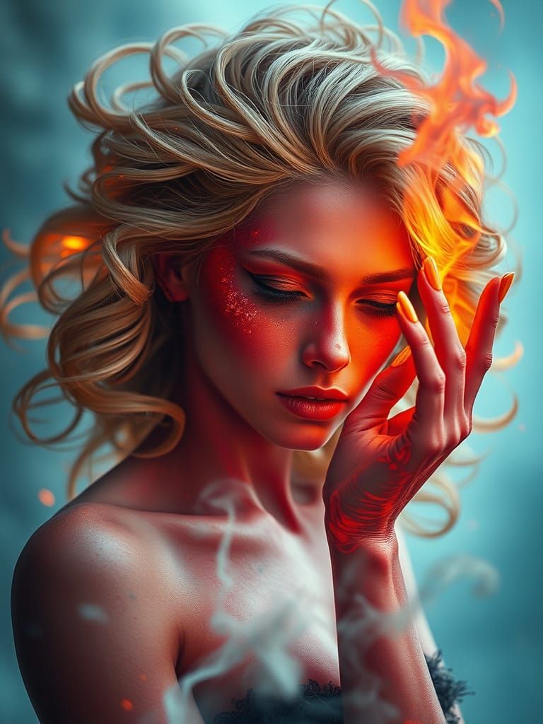 This image shows a female elemental spirit with molten skin and flaming hair. The artwork features soft focus and cinematic lighting, reminiscent of vibrant character designs in a dystopian setting.