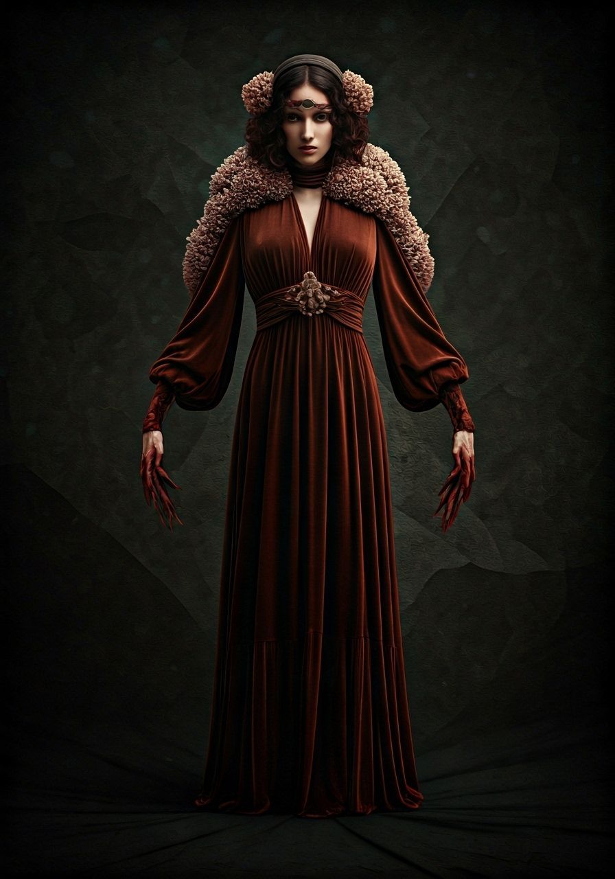 collage of hard knocks; by artist "Meret Oppenheim"; by artist "fractal fungi dresses"; by artist "Byzantium 3D sculpted velvet colorway" shadow people