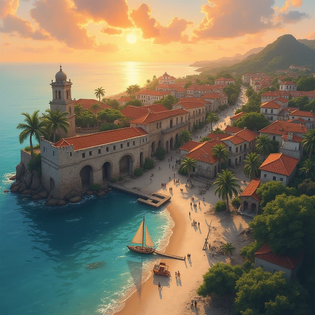 This image shows a historical Caribbean colonial city at sunset, featuring a stone fortress and colonial buildings. Rendered as a detailed architectural watercolor illustration with soft pastel colors and gentle lighting.