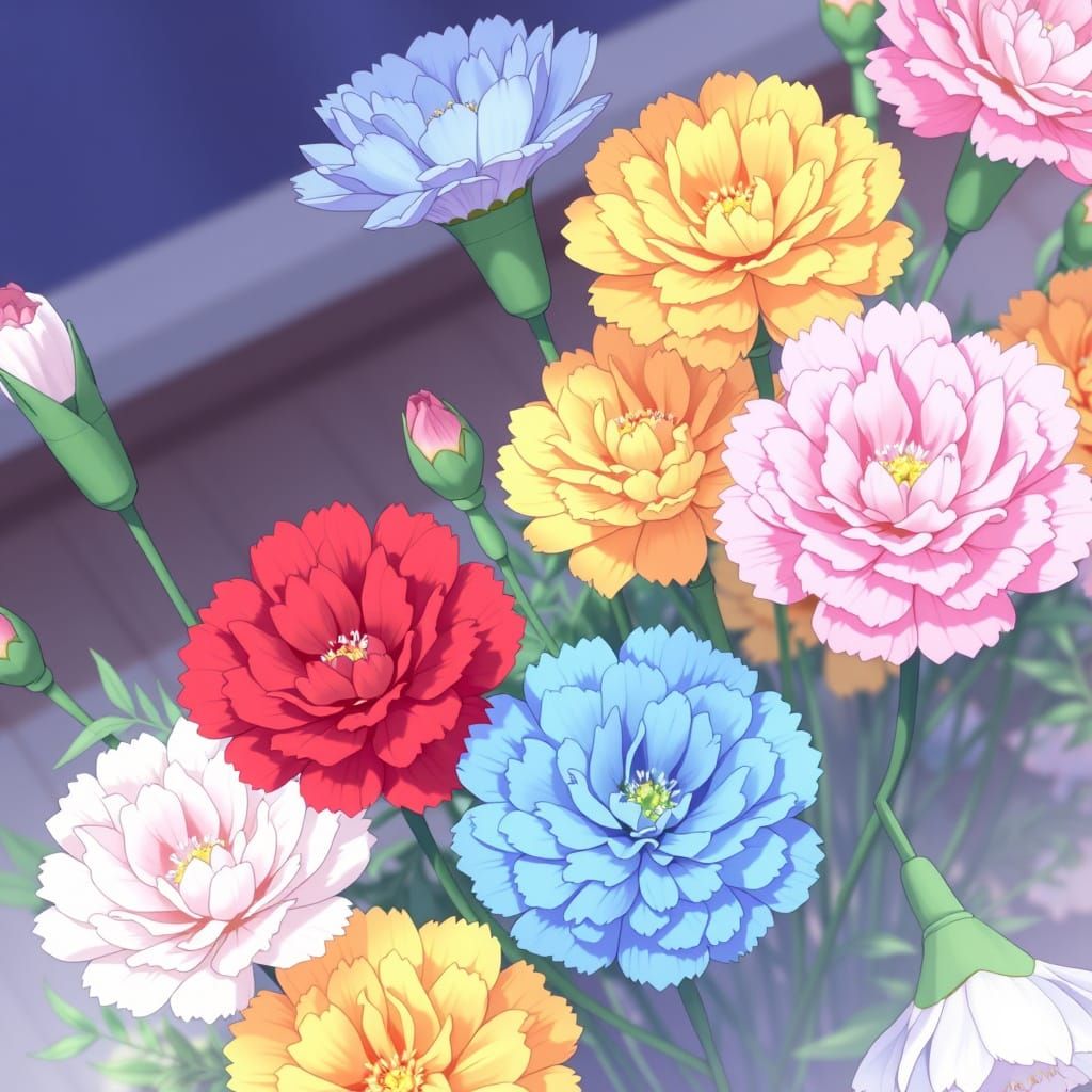 A digital anime illustration of vibrant carnations. The image evokes key visual elements from Japanese manga and anime art styles.