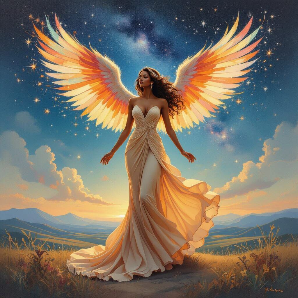 A striking picture of a caramel-skinned woman emerging as a phoenix from a tranquil landscape. The artwork features vibrant, ethereal colors and a dreamy, maximalist aesthetic with soft brushstrokes, reminiscent of impressionistic paintings.