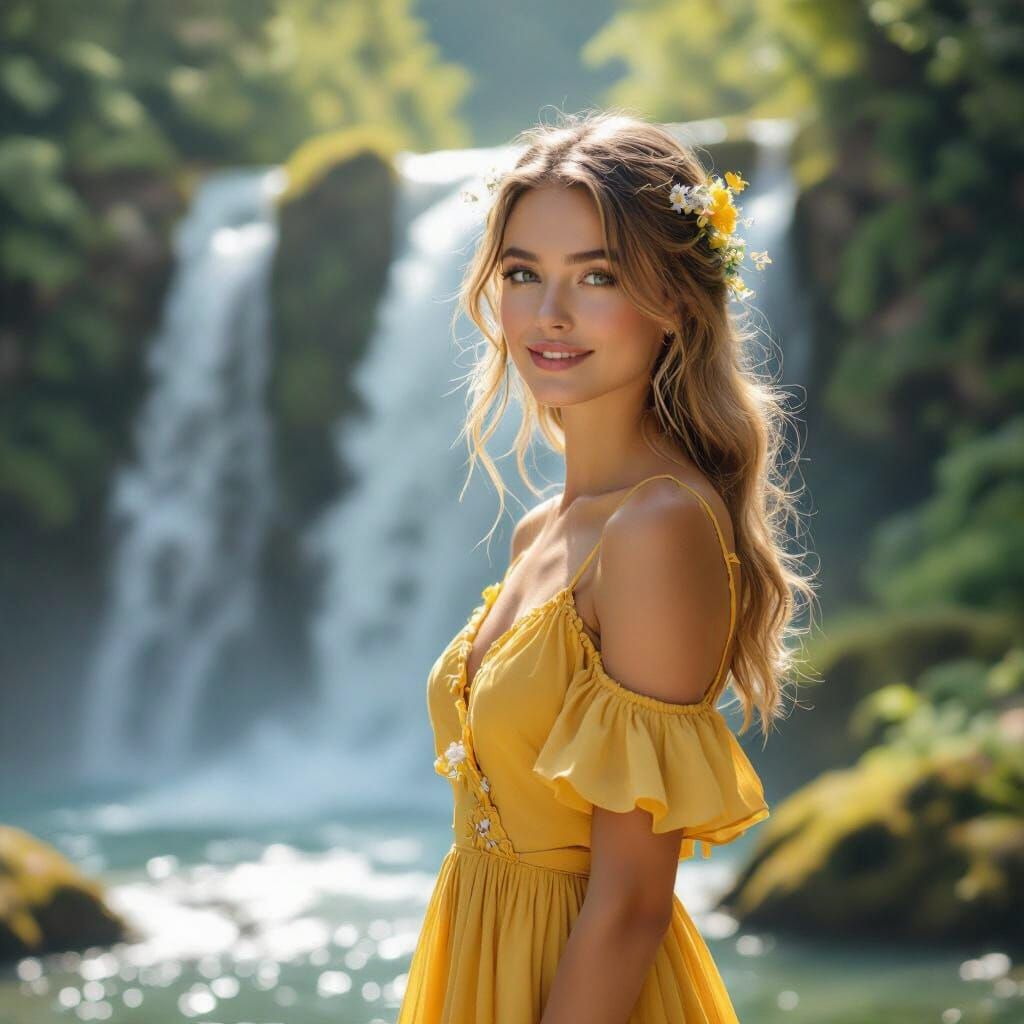 This image shows a serene European woman with flowing blonde hair adorned with wildflowers, standing gracefully before a waterfall. She is wearing a light yellow silk dress with floral embroidery, with hyperrealistic details.