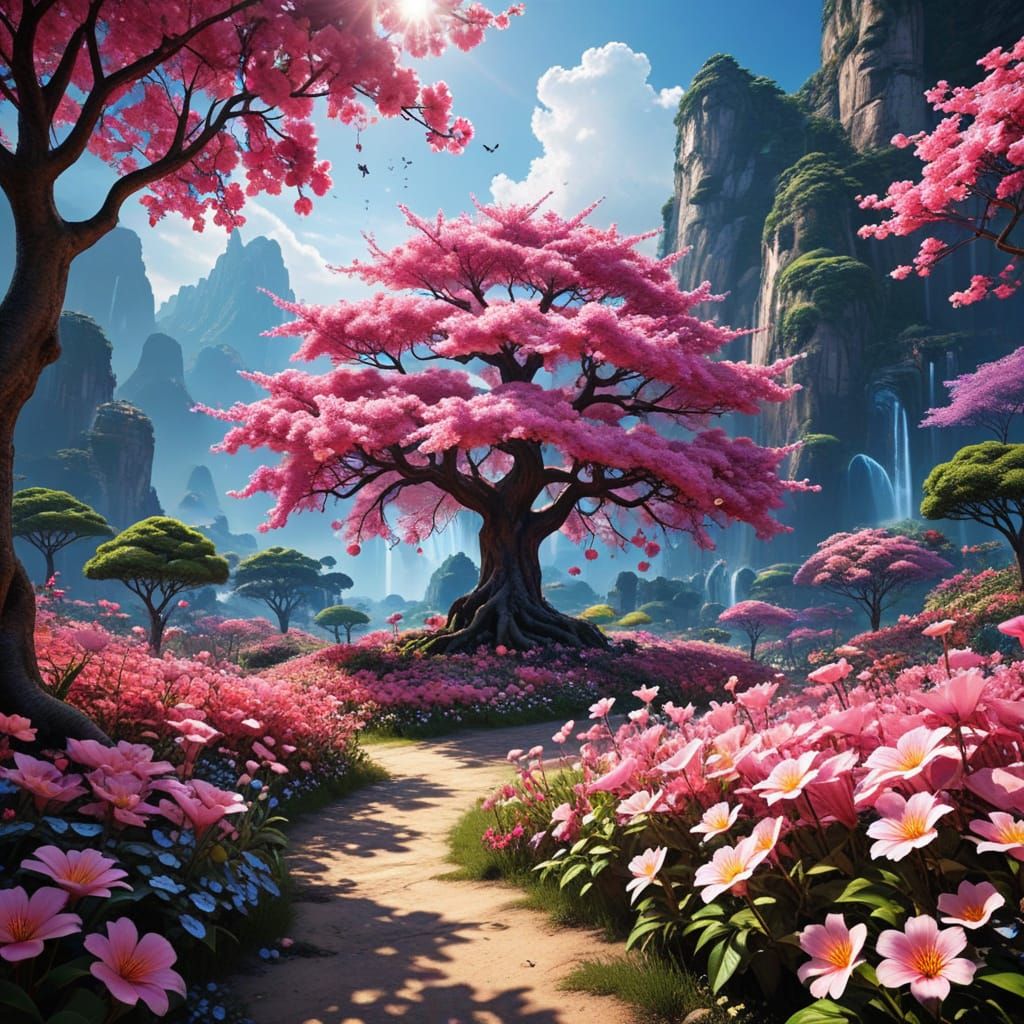 This enchanting image depicts a majestic, pink-hued flower tree set amidst a lush, natural landscape. The vibrant colors and whimsical atmosphere evoke a sense of wonder and mystery, transporting the viewer to a fantastical utopia.