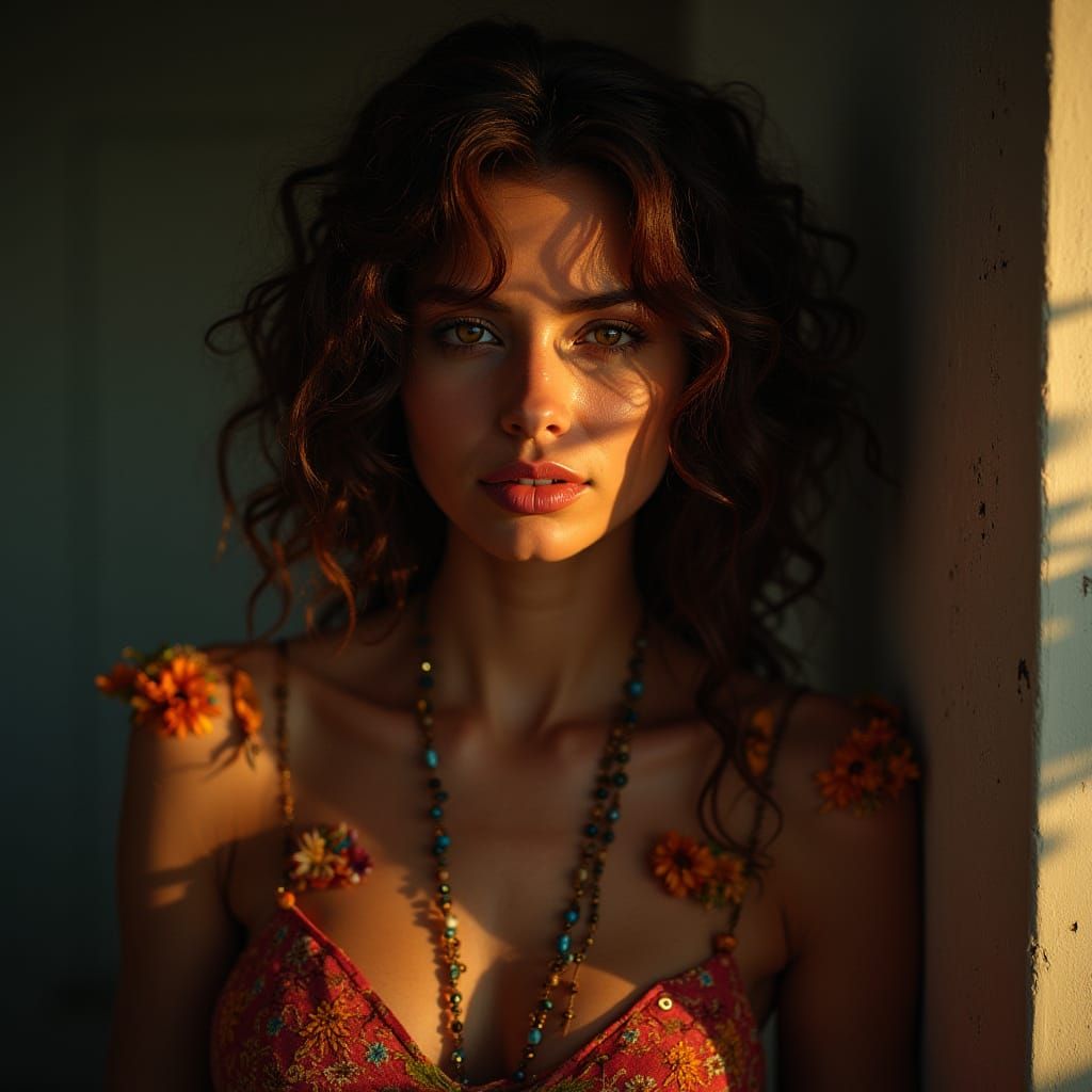 A striking picture of NovaKali, a woman in vibrant clothing, posing for a portrait. The image is bathed in soft, ambient light with a warm glow, in a moody, high-contrast style.
