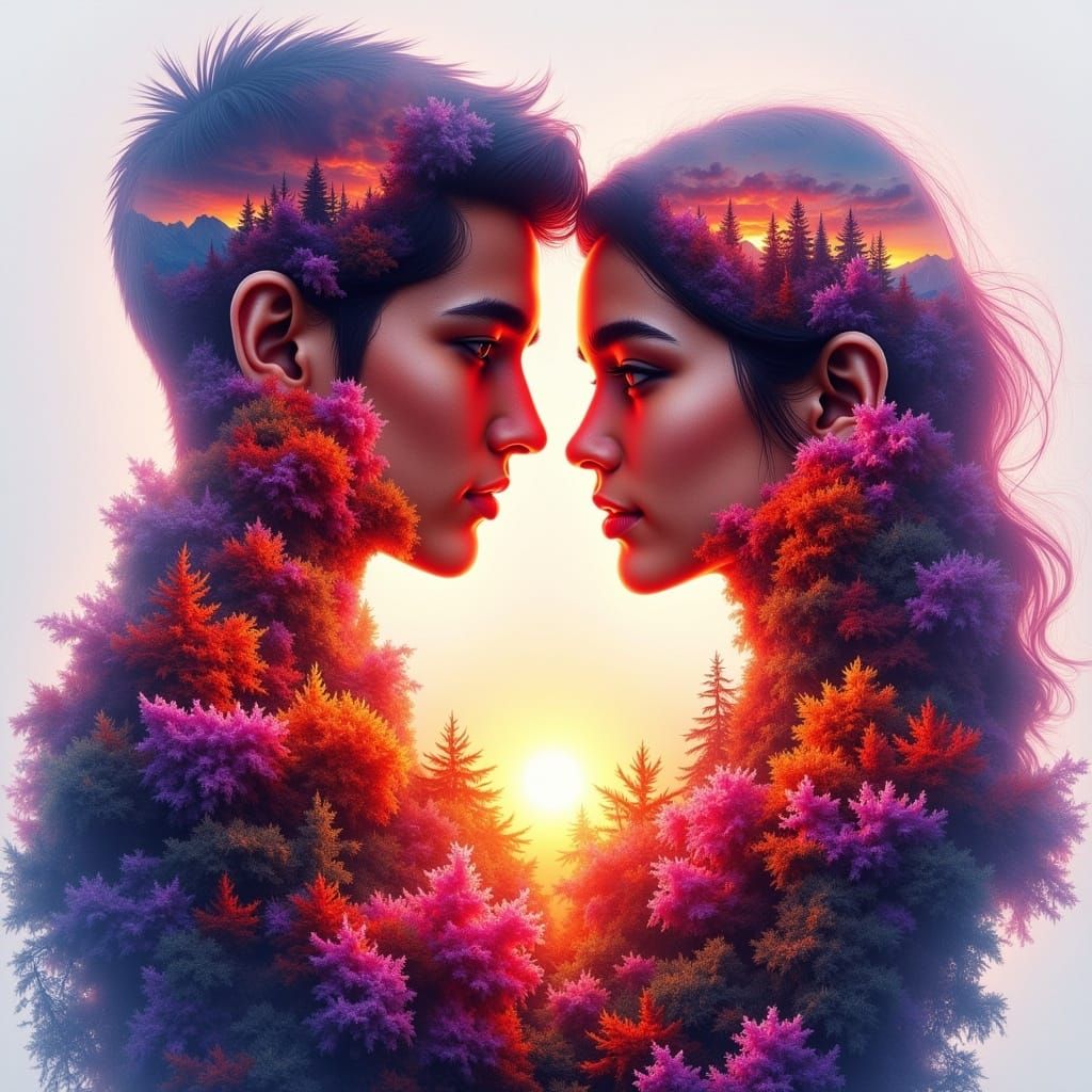 <lora:GlorifiedV2:1.0> Spiriling Double exposure close up a Couple man and woman Digital watercolor Illustration double exposed with heart shaped landscape sunset, by Waterhouse, Carne Griffiths, Minjae Lee, Ana Paula Hoppe, Stylized watercolor art, Intricate, Complex contrast, HDR, Sharp, soft Cinematic ...