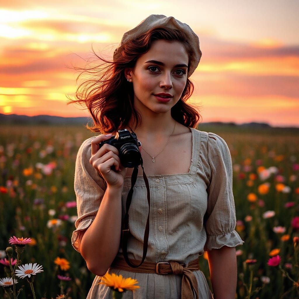 This image shows a young woman with a vintage camera in a wildflower field at sunset. The golden age illustration style evokes a nostalgic and atmospheric feel with painterly textures.
