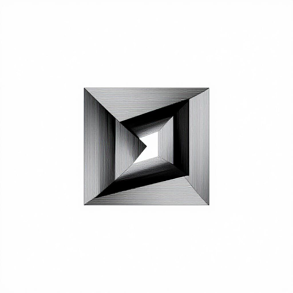 This image shows a detailed, abstract geometric symbol in black and white, floating in a void. It features a minimalist aesthetic with sharp lines and a strong sense of depth, inspired by early digital graphics.