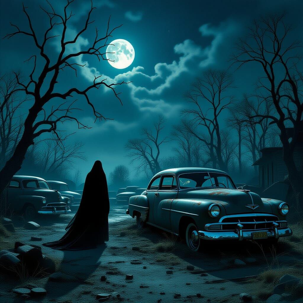 A hyperrealistic, surreal image of a spectral figure in a decaying vintage car graveyard at midnight. Eerie moonlight and deep shadows create a dramatic, atmospheric scene.
