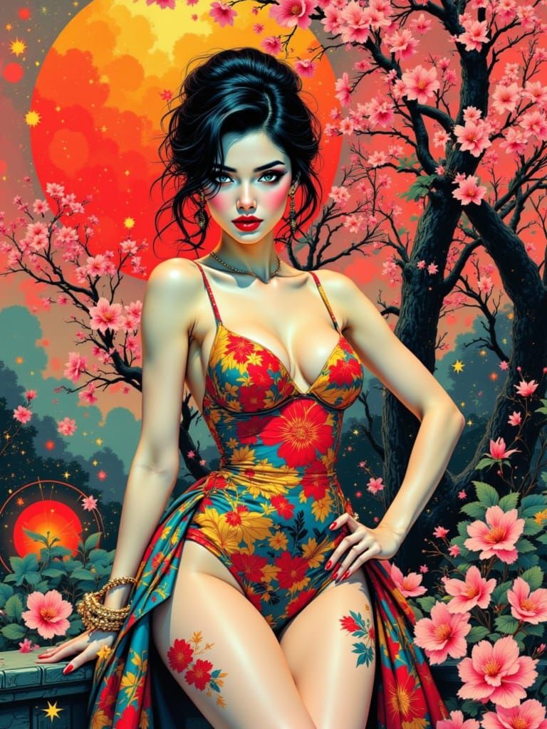 This image blends a retro pin-up style with Mondrian-inspired geometric art, set against a backdrop of abstract patterns and a cherry blossom garden.