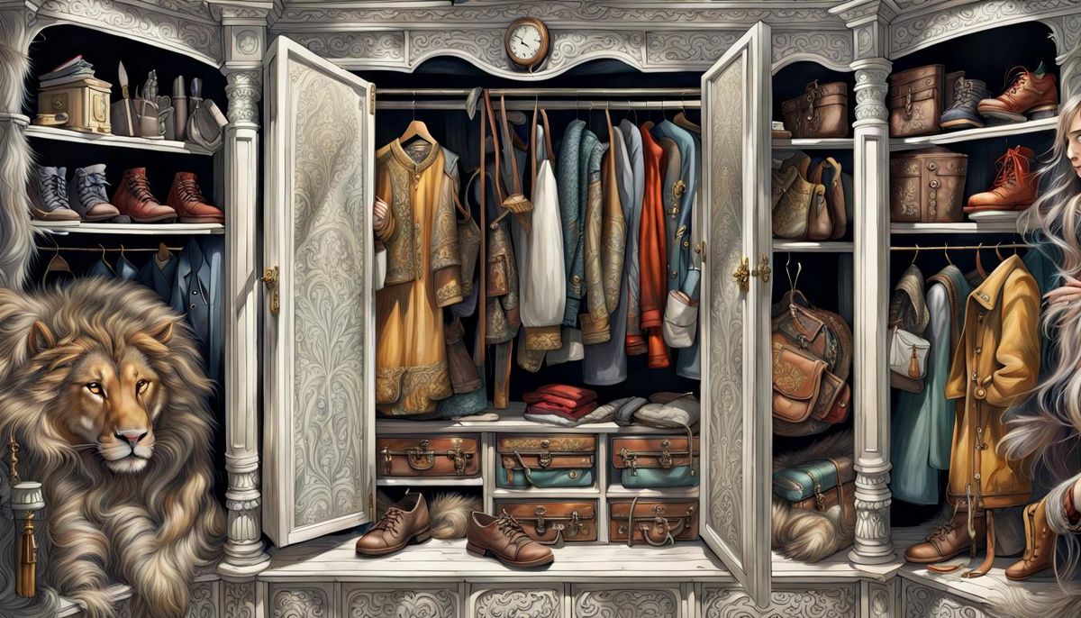 A detailed fantasy artwork depicting the entrance to Narnia through a wardrobe. The image captures the magical realism of the fantasy world, rendered with intricate detail.