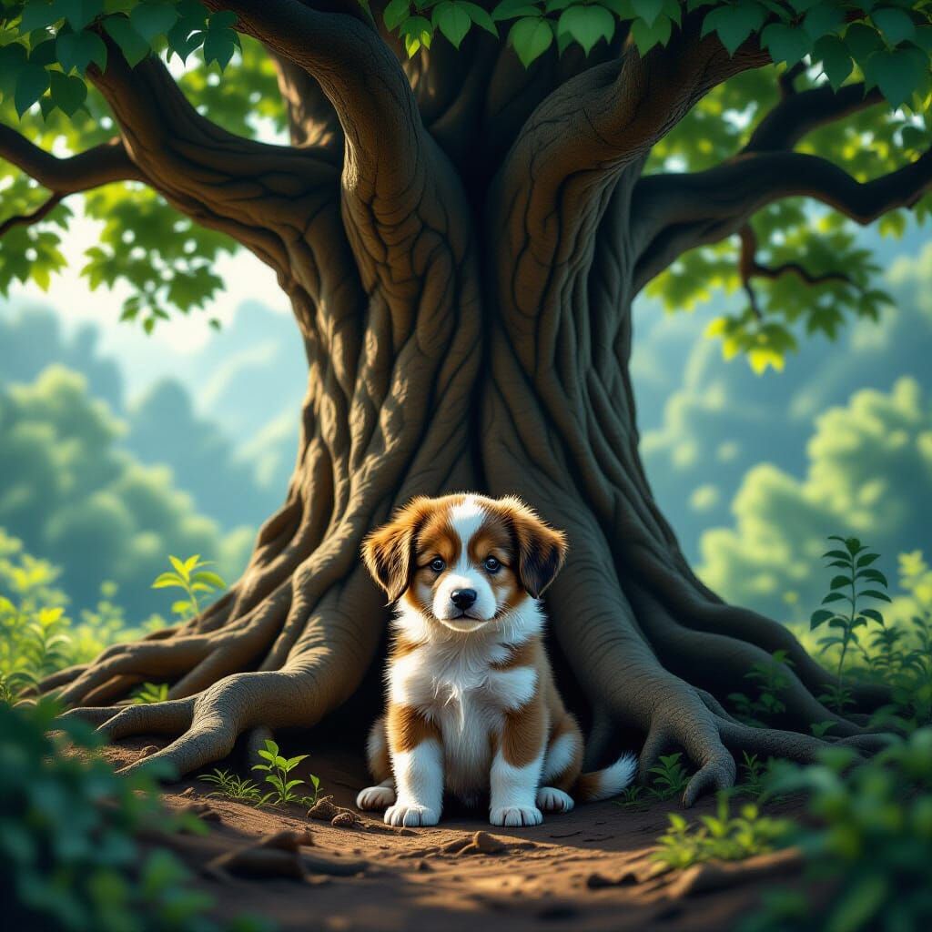 This image shows an adorable puppy sitting beneath a large tree with detailed roots and branches. The scene is dramatically lit and evokes the style of digital matte painting.