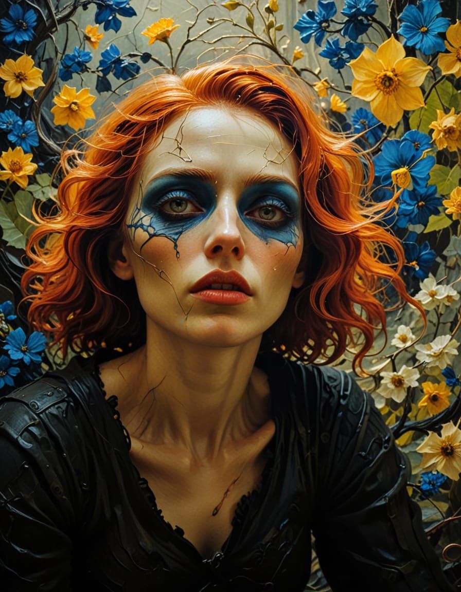 This image shows a young gothic woman surrounded by lush flowers and vines, in a style reminiscent of Van Gogh's expressive brushstrokes and vibrant colors, with a dark romantic and mystical atmosphere