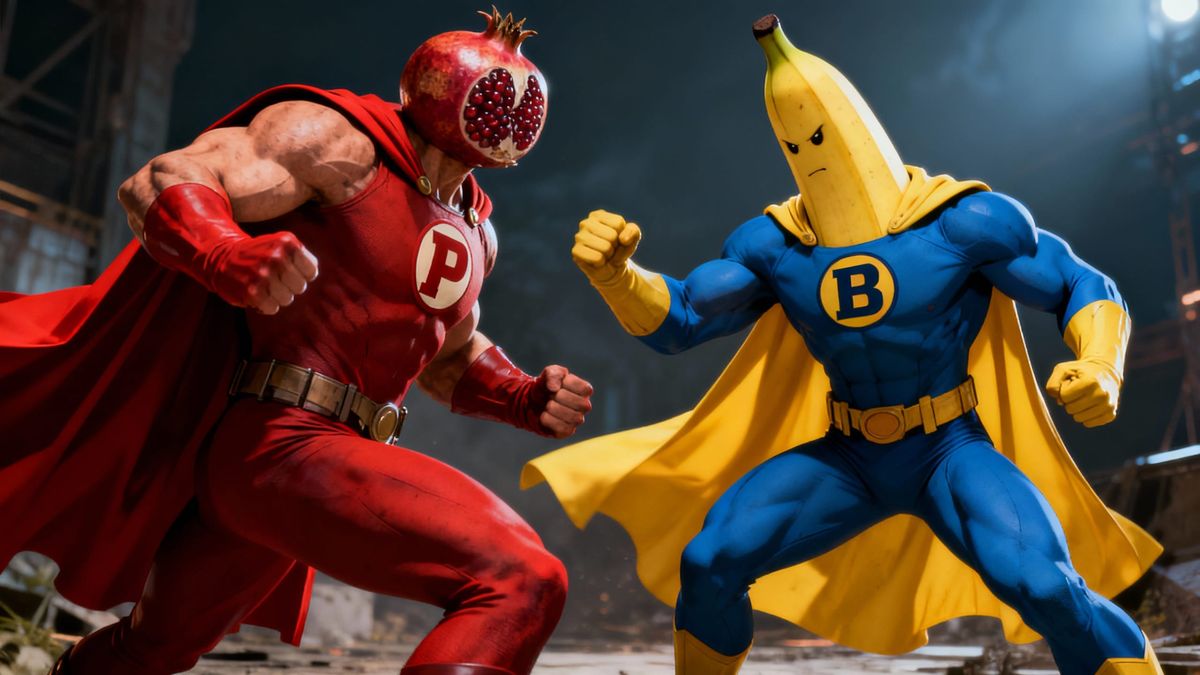 This image depicts a muscular Banana Man in a blue suit and yellow cape facing the villainous Pomagranate Man. Rendered in a realistic 3D style with dramatic lighting.