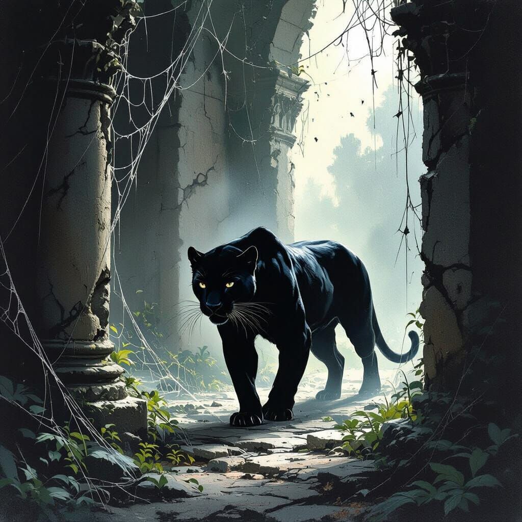 This image shows a solitary black panther moving through an ancient, overgrown ruin. Dramatic chiaroscuro lighting creates deep shadows and highlights, with dewy spiderwebs in a gothic illustration style.