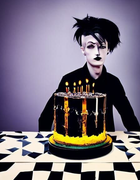 This image captures a striking contrast between a gloomy goth boy and a cheerful birthday cake, enhanced by dramatic cinematic lighting.