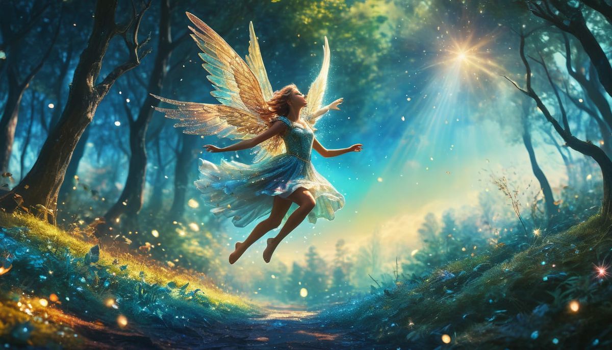 This image shows an angel descending from the sky into a woodland scene. The artwork is rendered in vibrant colors with iridescent wings and sparkling fairy dust, presented as a detailed digital painting.