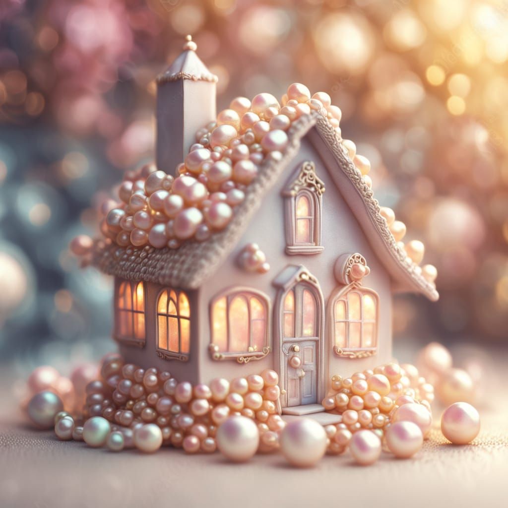 A striking picture of a tiny house constructed from luminous pearls. Macro photography captures the iridescent sheen and delicate textures of this whimsical fantasy artwork. Soft focus and warm golden lighting create a dreamy atmosphere.