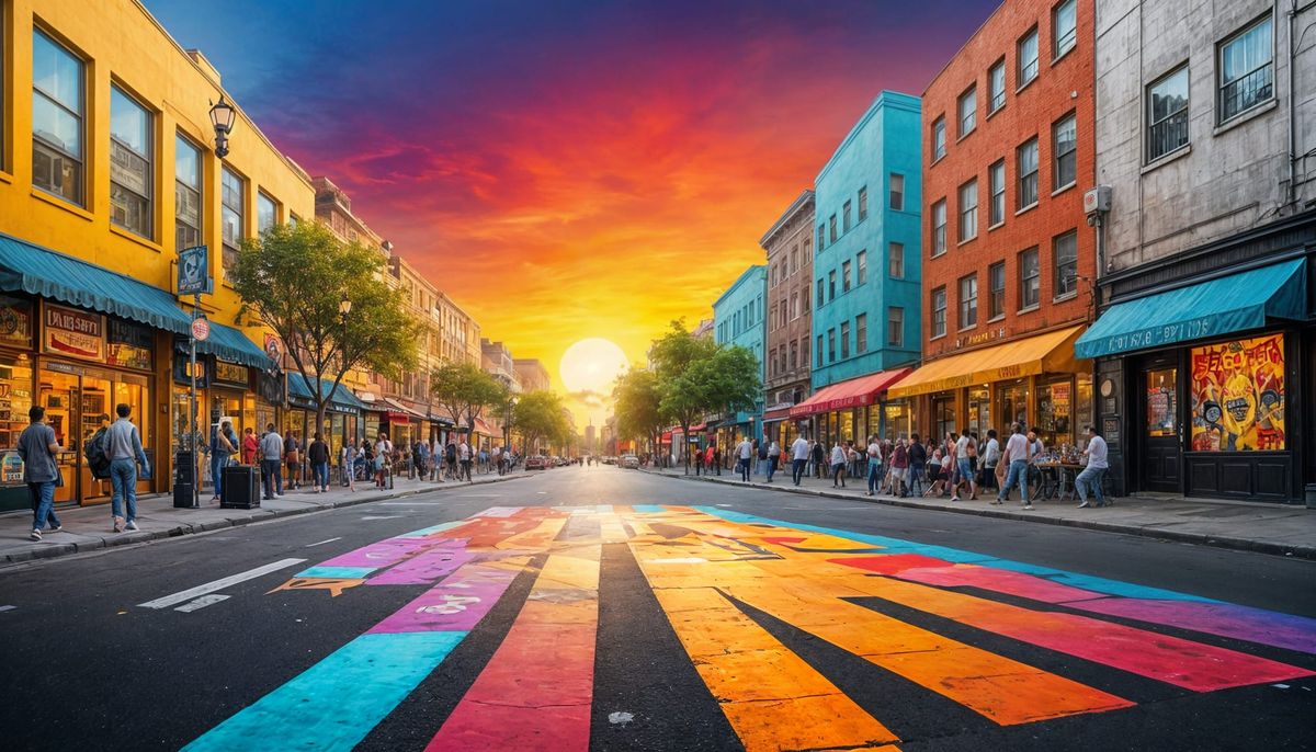 This image captures the energy of a street dance performance in a bustling city, with dancers moving in perfect sync to the rhythm of the music, surrounded by vibrant colors and lively atmosphere.