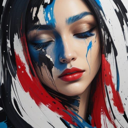 A close-up portrait of a woman with eyes closed, rendered in bold, gestural brushstrokes. Features electric blue lips against a monochromatic palette, conveying raw emotion.