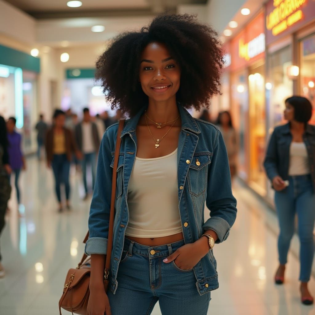 This image shows a young African American woman in casual spring attire standing near a vibrant clothing store. It showcases photorealistic textures and lighting, creating a vivid and lifelike scene.