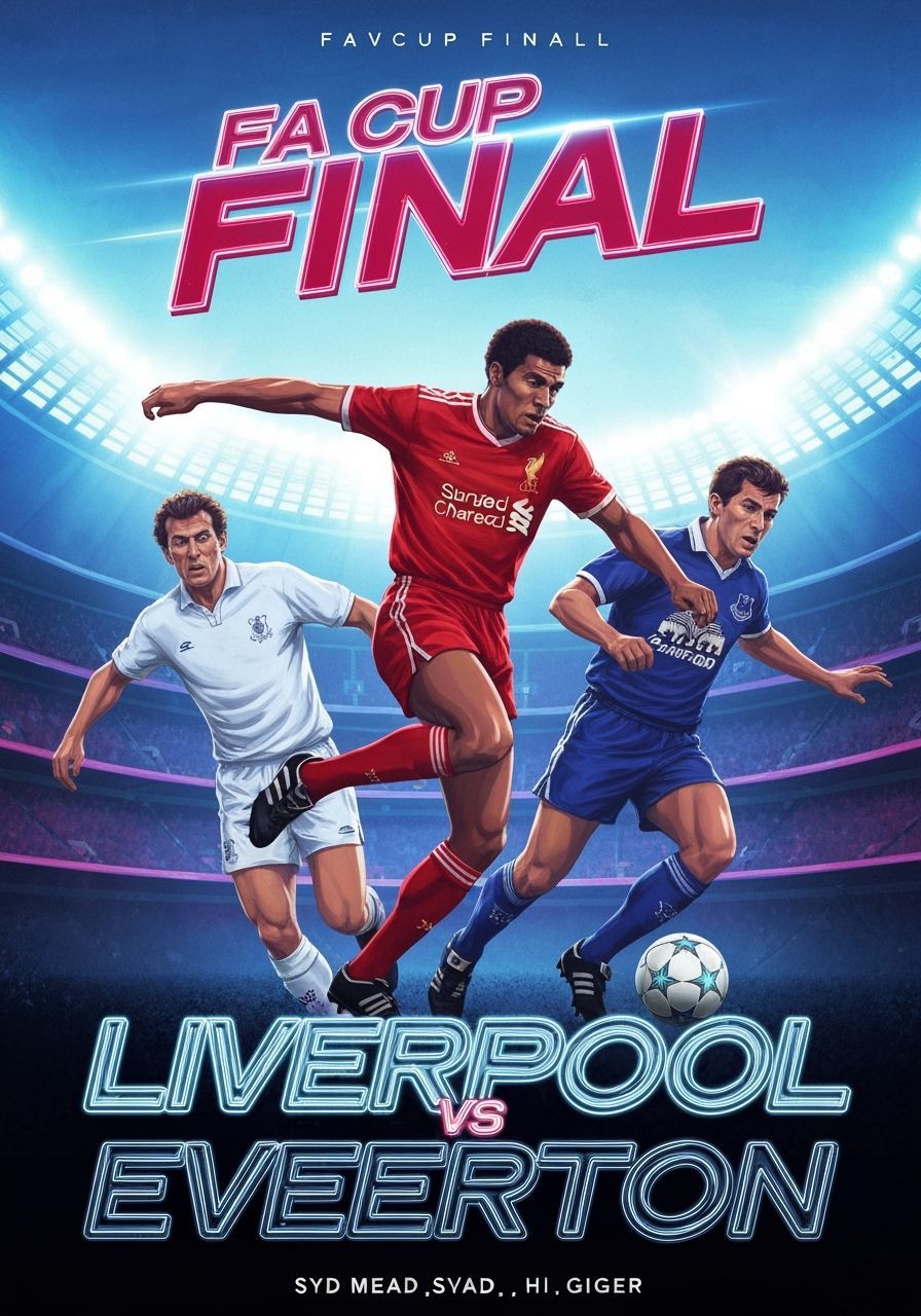 Dynamic 1980s style illustration of Liverpool and Everton players in a neon stadium. Features bold, graffiti-like typography for the FA Cup Final.