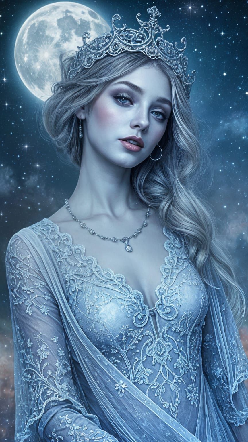 This image depicts a mystical woman amidst a dreamlike atmosphere, surrounded by celestial elements and intricate lace patterns.