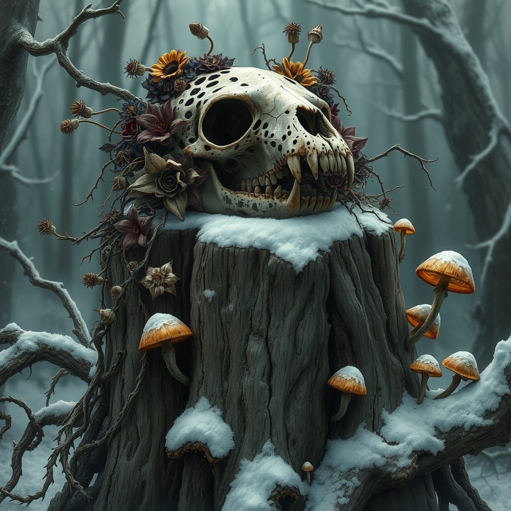 This haunting image features a leopard skull surrounded by dark flowers, mystical artifacts, and glowing mushrooms, evoking a gothic atmosphere reminiscent of somber, ornate illustrations.