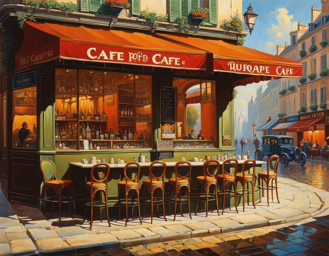 This image shows a vintage French cafe rendered as an oil painting. The hyperrealistic artwork features intricate details, dramatic lighting, and a colorful background in a splash art style.
