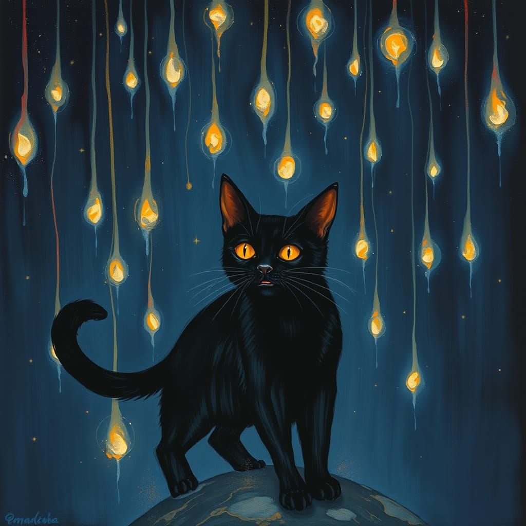 This image shows a black cat distressed by glowing celestial tears falling from a dark sky. Rendered with elongated forms and bold colors, it features dramatic lighting and a striking color contrast.