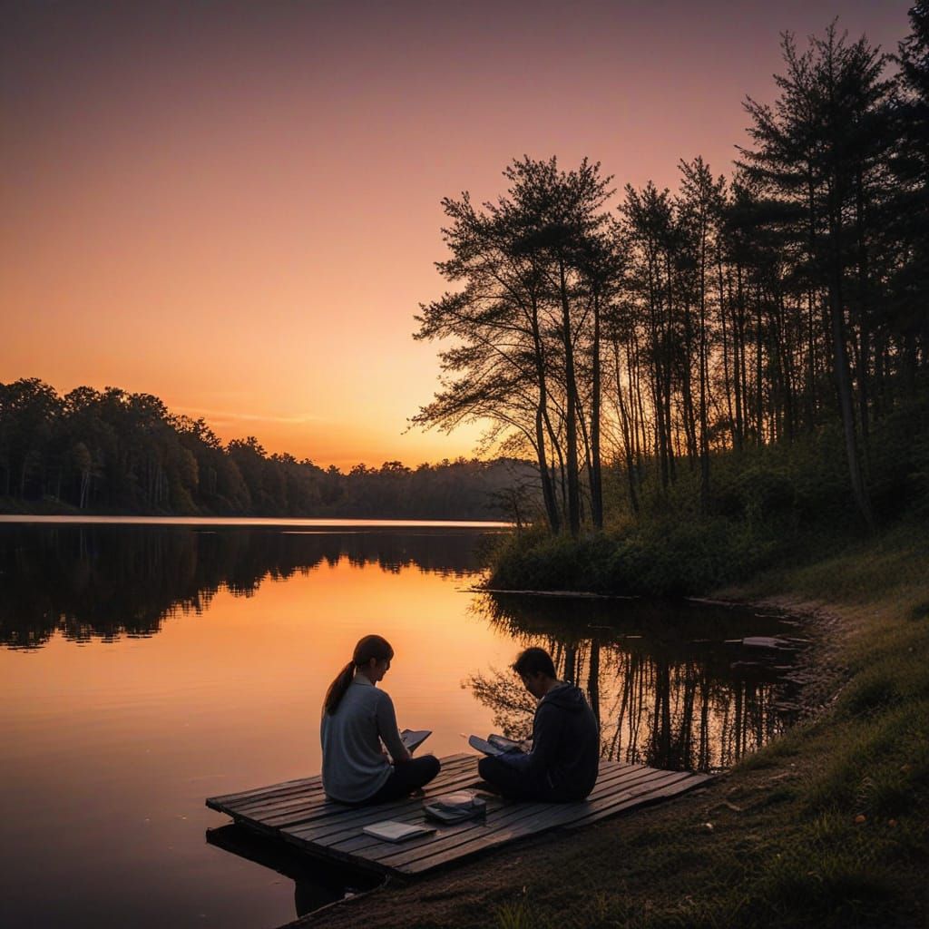 A serene couple sits by a peaceful lake, reading a book as a breathtaking sunset unfolds behind them, with vibrant colors and soft warm light.