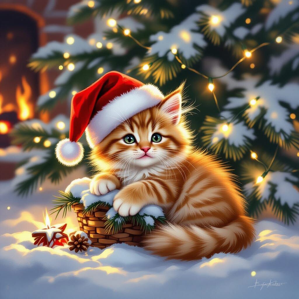 This charming image shows an adorable ginger kitten in a Santa hat nestled within a glowing, snow-covered Christmas tree. Rendered in a heartwarming illustrative storybook style with soft textures and vibrant colors.