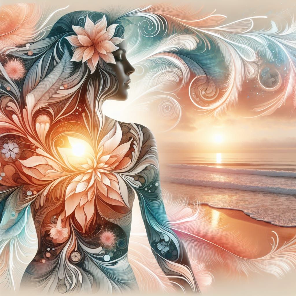 hyperdetailed intricate organic layered double exposure digital liquid ink watercolor oil pastels Illustration of a woman filled with the perfectly hand-lettered word "Paradise" and a sunset on a paradisiac beach that merge to form a single composite image : art by Catherine Hyde and Frances Mc Donalds, ...