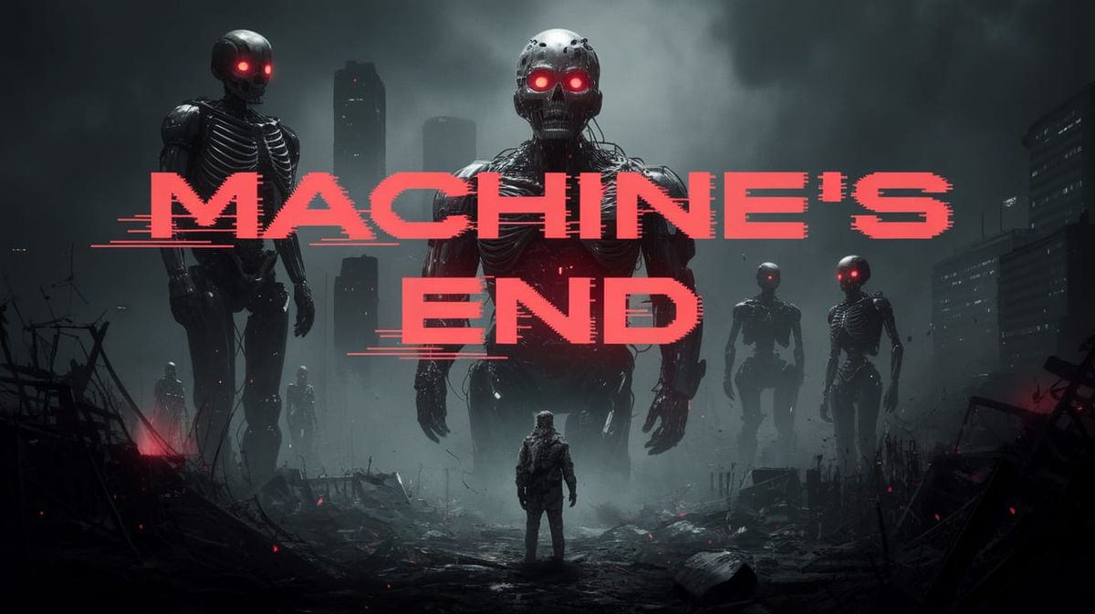 This haunting image depicts a ruined cityscape consumed by darkness and smoke, where twisted AI war machines loom over a wounded human figure. A colossal, humanoid AI towers above, symbolizing a fusion of human and machine, amidst an atmosphere of inevitable doom and eerie shadows.