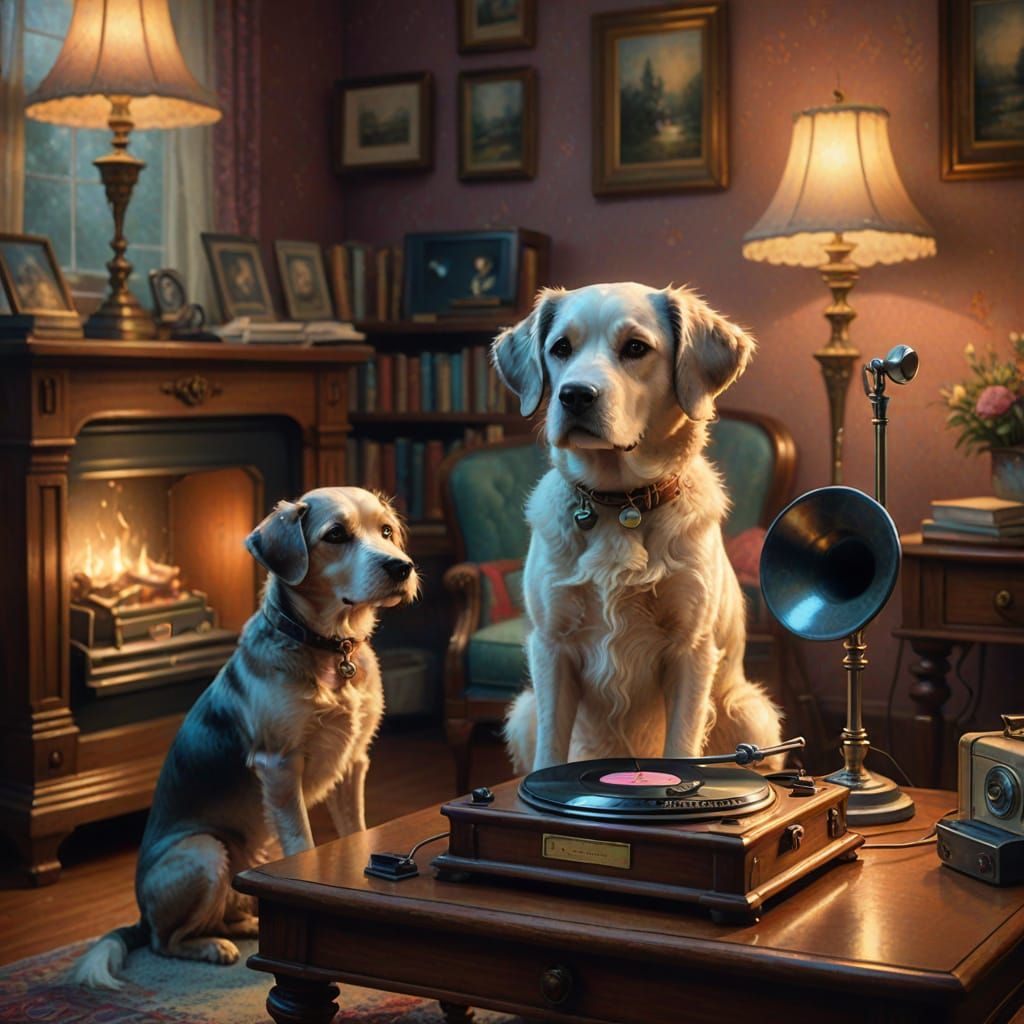 This enchanting image captures a dog's serene moment as it listens to a vintage grammophone in a cozy, nostalgic living room setting, illuminated by warm candlelight and surrounded by soft, misty textures and vibrant colors, reminiscent of a Thomas Kinkade painting.