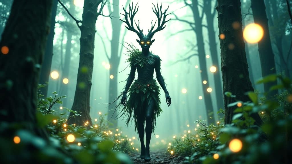 This enchanting fantasy art piece depicts a whimsical forest spirit with glowing eyes and antlers, set amidst a serene moonlit grove filled with fireflies and the scent of pine and damp earth, exuding a sense of magic and wonder.