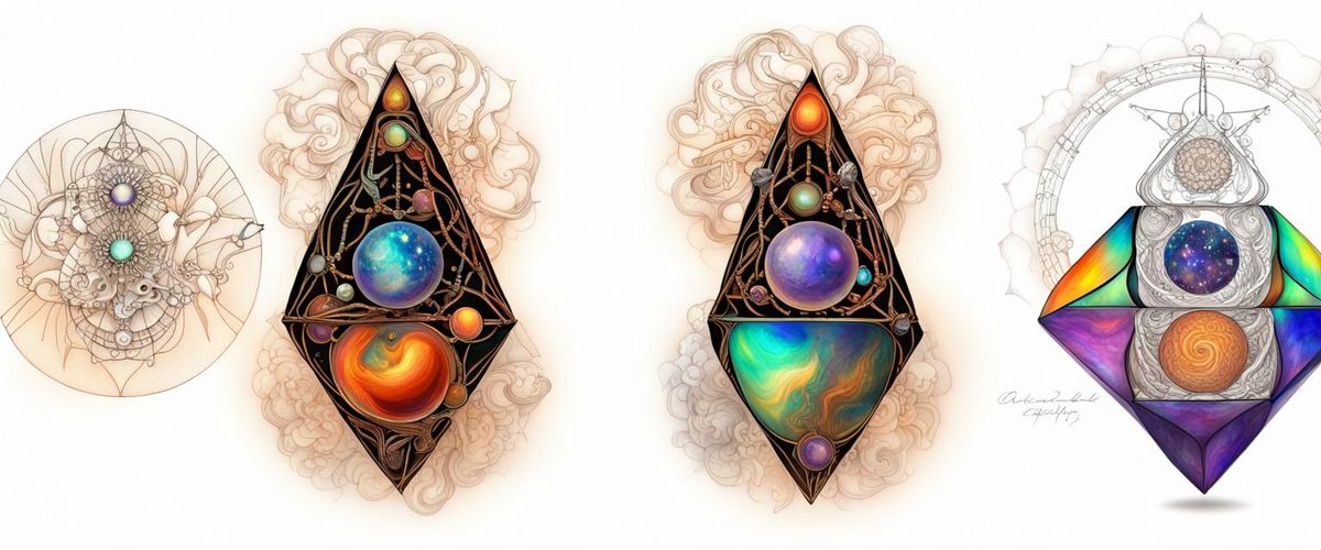 This image shows an abstract design with fire and opal-like textures. It incorporates 3D shading, geometric patterns, zodiac symbols, and Druidic rune symbology in a vibrant, fractal-inspired style.