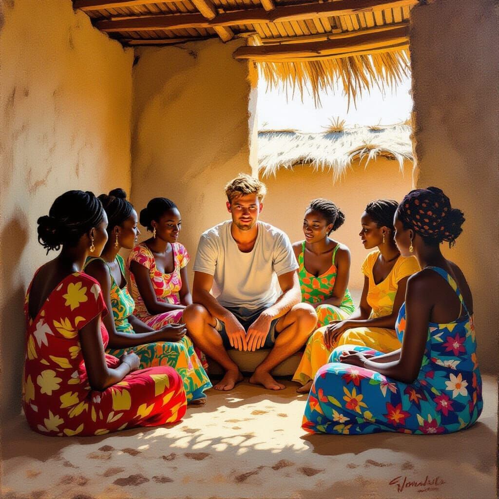 This image depicts a serene scene of a man sharing a humble shelter with several women in a small African village. Rendered with painterly brushstrokes and warm, earthy tones, it evokes community and connection.