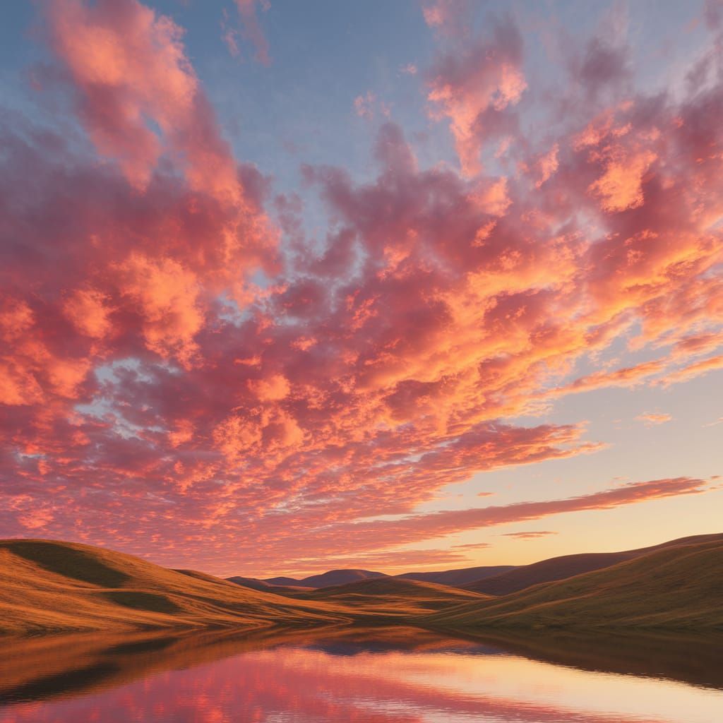 A serene natural scene depicting a sunset with vibrant hues and a tranquil landscape, rendered in a realistic style with intricate detail.