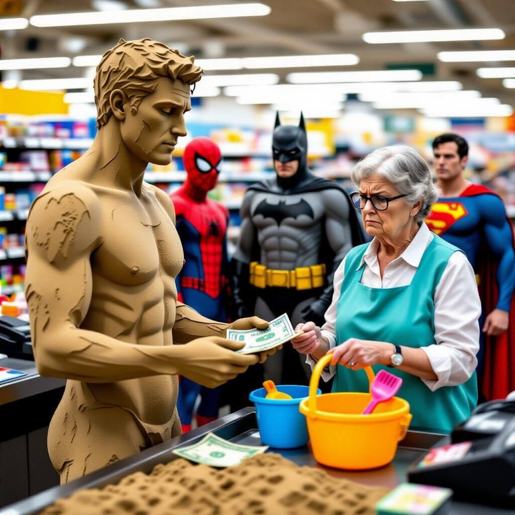 Ulta realistična foto slika u 8k rezoluciji na kojoj se vidi čovek koji je napravljen od peska kako stoji za kasom i plaća robu koju je kupio u velikoj prodavnici. Kupio je dečiju kanticu za plažu i lopaticu za igranje sa peskom i kanticu za zalivanje sa vodom. Plaća starijoj zeni kasirki sa novčanicama ...