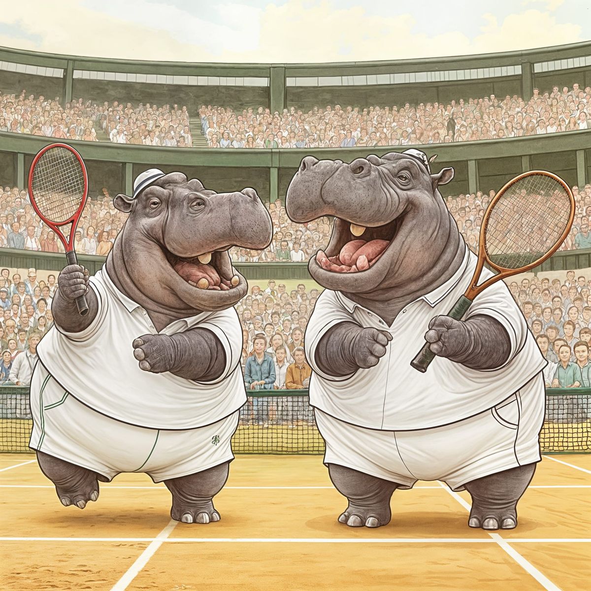 This image shows two hippos playing tennis at Wimbledon. They are wearing undersized traditional tennis clothes and display expressions of fun and excitement.