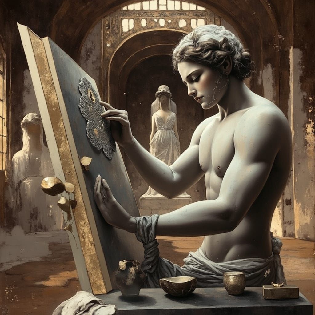 A serene young woman sits on a pedestal, surrounded by rustic studio ambiance, softly illuminated by warm golden light, wearing a flowing gown with intricate lace trim and a cameo brooch, in a Realistic and Academic art style with Impressionist softness