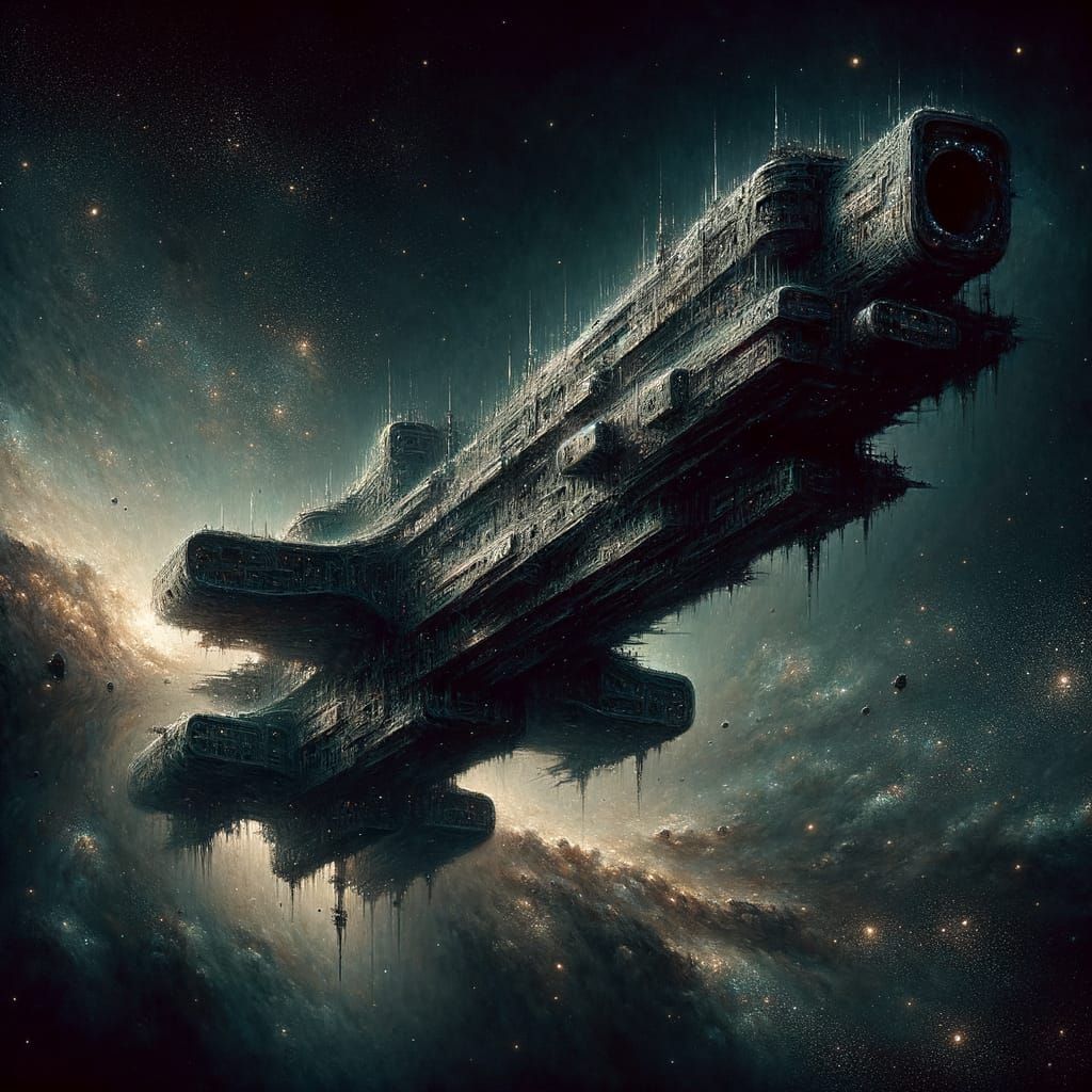 A haunting image of a lone spaceship suspended in space, its exterior weathered and clean, with a single porthole shining dimly, evoking a sense of mystery and foreboding in a dark, oil-painted style reminiscent of late-Romantic era art