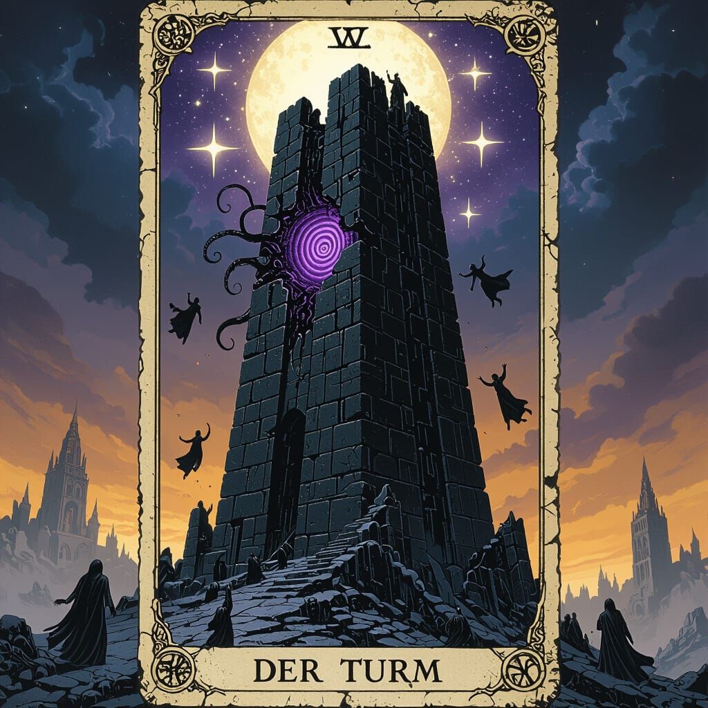 A gothic Warhammer-inspired tarot card depicting a shattered black stone tower fused with chitin, releasing tentacles and falling figures. Features star children above and glowing flames below, in a violet-gold frame.